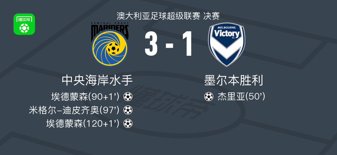 北京时间5月25日澳大利亚足球超级联赛 决赛,中央海岸水手主场对阵墨尔本胜利。墨尔本胜利杰里亚率先破门,下半场补时第1分钟,埃德蒙森打入一球扳平比分并将比赛拖入加时,加时赛第7分钟,迪皮齐奥打入一球帮助水手反超比分,加时赛补时第一分钟埃德蒙森上演梅开二度并锁定胜局,最终比分中央海岸水手 3-1 墨尔本胜利,夺得澳超冠军。