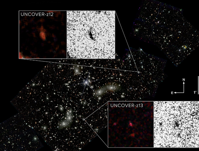 王和她的团队也识别出了这两个高红移星系的透镜影像。一个编号为UNCOVER-z13(z是红移的代号),红移值是13。079,已确认是已知的第二遥远的星系。(已证实最遥远的星系是JADES-GS-z13-0,2022年也是由詹姆斯韦伯空间望远镜发现,红移值13。2)。我们能看到UNCOVER-z13是因为大爆炸之后它才存在了3。3亿年。