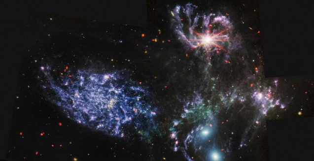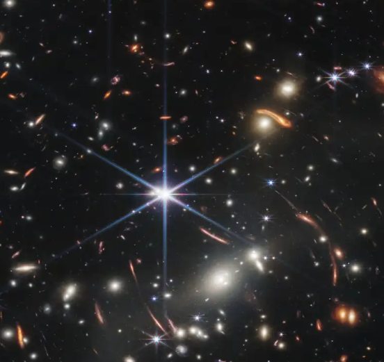 詹姆斯韦伯空间望远镜观测到的潘多拉星团。潘多拉星团可作为发现新星系的引力透镜。