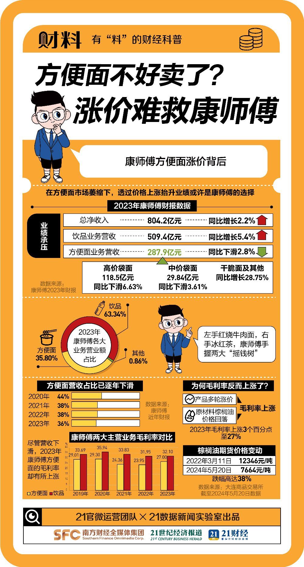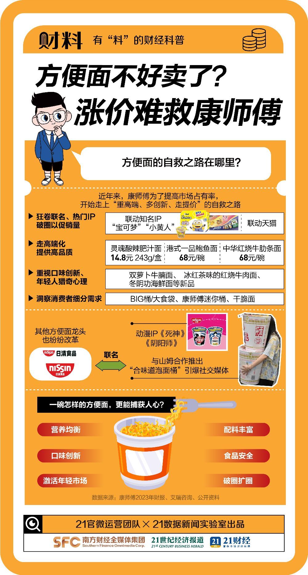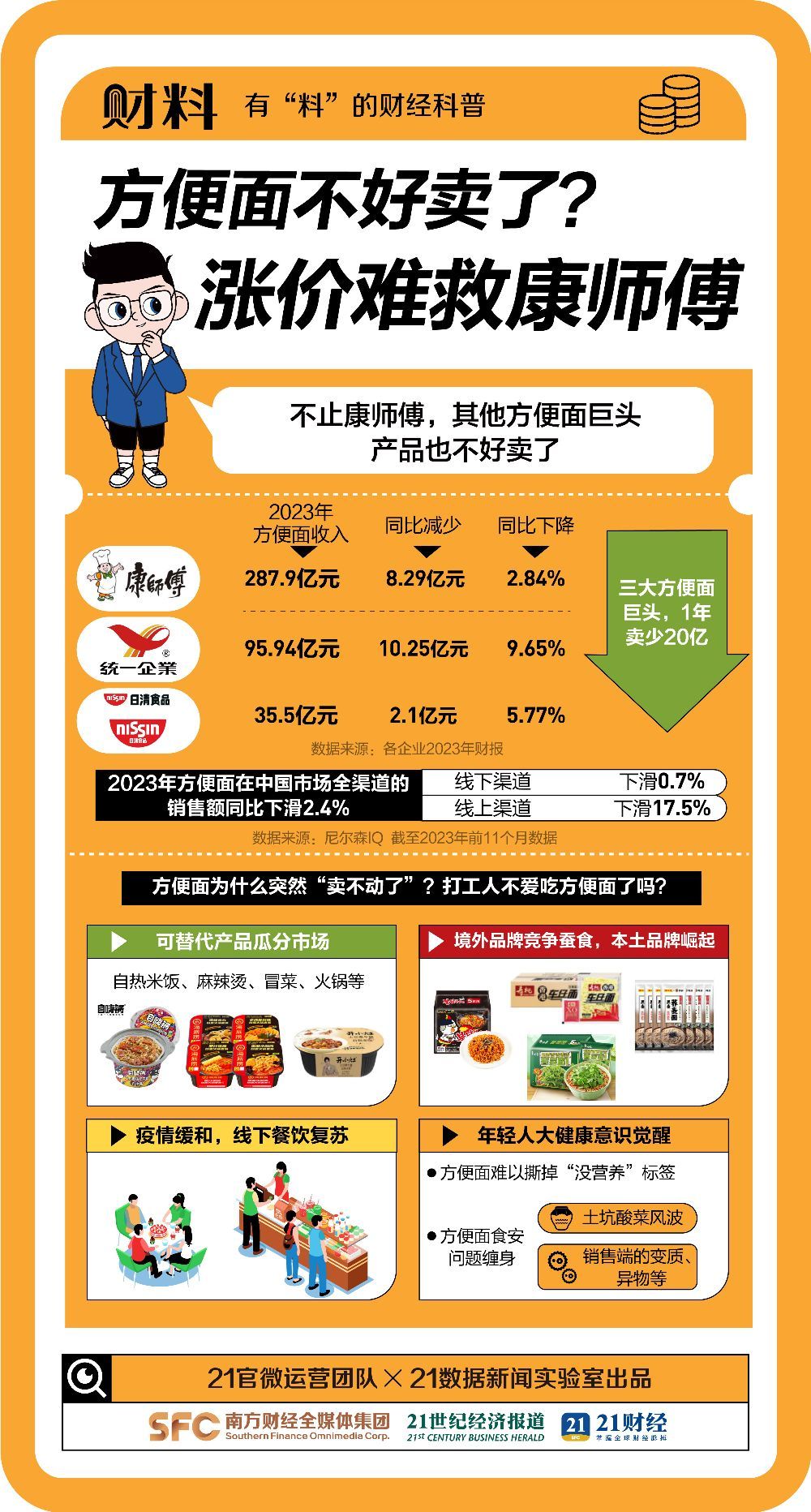 21数据新闻实验室据最新财报统计发现,相较2022年,2023年康师傅、统一企业、日清食品三大巨头的方便面业务,一共少卖20亿元。