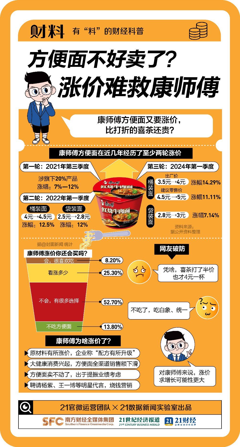 方便面为什么突然“卖不动了”?打工人不爱吃方便面了吗?方便面涨到5元,奶茶降到4元,泡面比奶茶贵,是什么信号?方便面巨头们的自救之路在哪里?本期《财料》跟你聊聊。