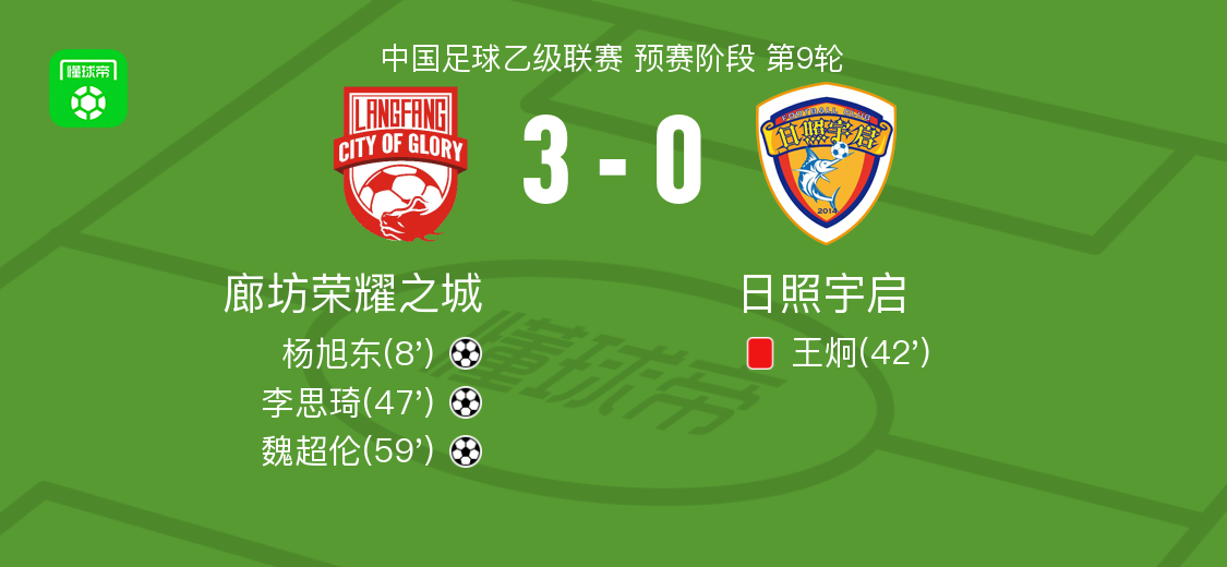 北京时间5月26日中国足球乙级联赛 预赛阶段 第9轮,廊坊荣耀之城主场对阵日照宇启。廊坊荣耀之城杨旭东破门,李思琦破门,魏超伦破门。最终比分廊坊荣耀之城 3-0 日照宇启。