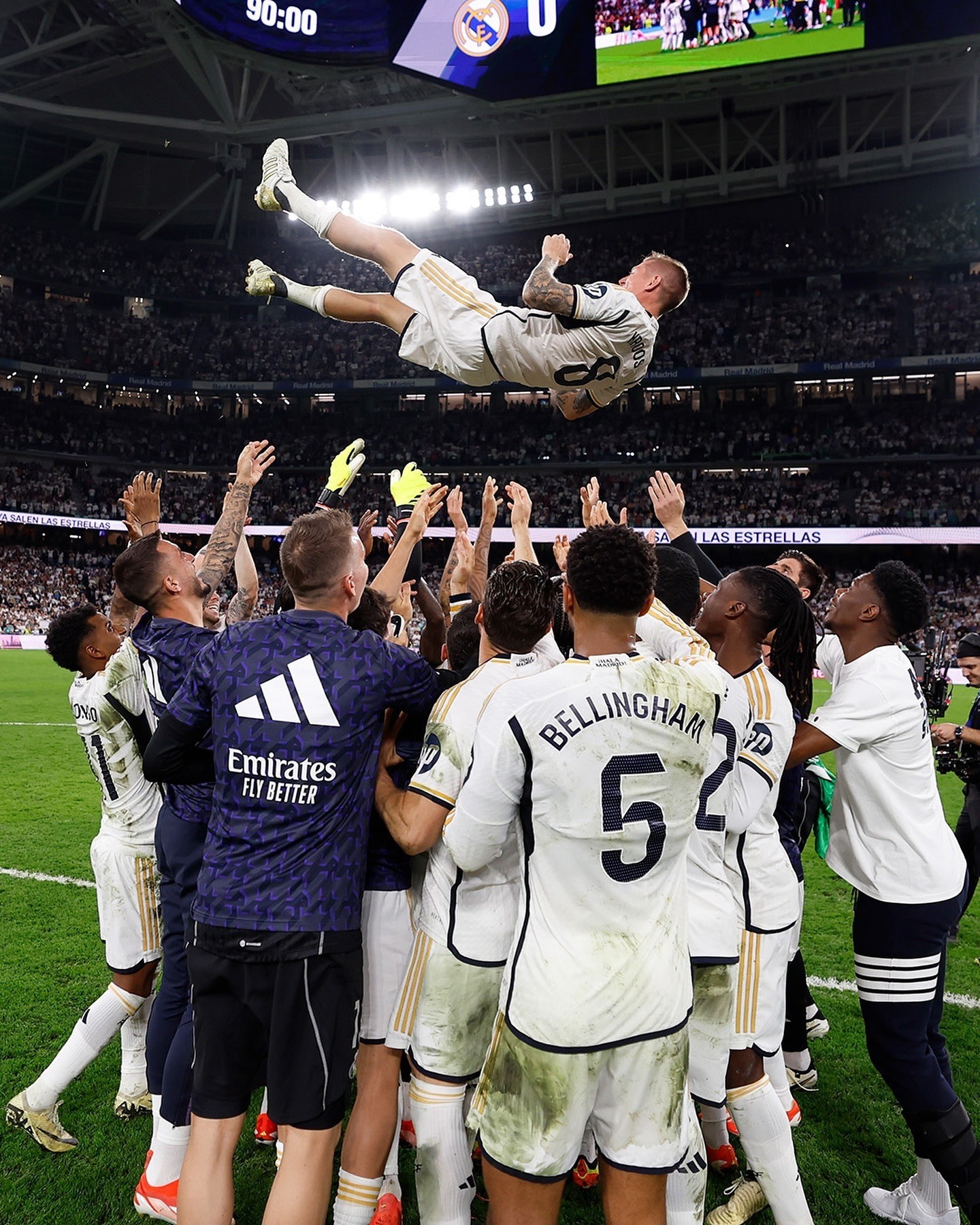 齐达内在社交媒体晒出了克罗斯在最后一场比赛中的照片,并写道:他是一位伟大的球员,也是一个伟大的人。感谢你,托尼!