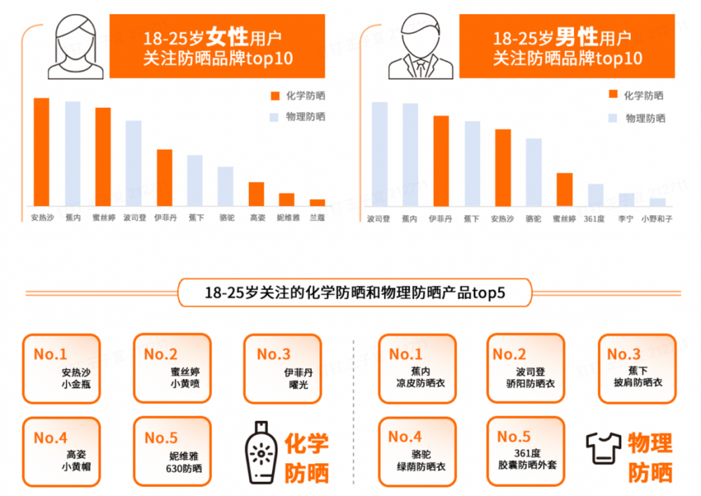 对比18-25岁男女用户品牌互动情况后我们发现,在物理防晒大行其道的当下,女性用户并未减少对防晒化妆品的关注,top10互动品牌中有6个是化学防晒品牌。物理防晒、化学防晒各有优势,但对女性来说多层防护才更放心。