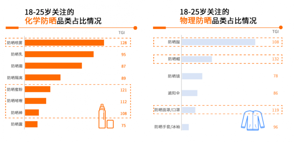 防晒场景方面,18-25岁用户既有多元化的场景关注特征,又对自身个性需求场景表现出更高的偏好。如对练车、军训、徒步、滑雪的偏好程度显著高于整体防晒人群。