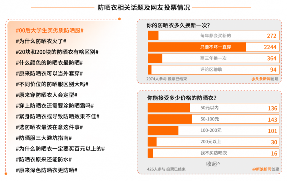 4月17日,一条#00后大学生买劣质防晒服#的话题冲上了热搜。事情的起因是一位00后大学生买到劣质防晒服穿上后胳膊长满红疹,随后#20块和200块的防晒衣有啥区别#、#穿上防晒衣还需要涂防晒霜吗#、#防晒服三大避坑指南#等话题也持续发酵,由此引发了大量网友对目前的防晒服市场乱象及相关科普内容的关注。通过整理与防晒服相关的微博投票我们发现,虽然防晒服火爆防晒市场,但消费者似乎要冷静得多。无论是只要穿不坏就不换新,还是对100元以下的防晒服接受度更高,都说明要想在消费者心中为防晒服种下一颗高端防晒的种子,品牌们还有很长的路要走。