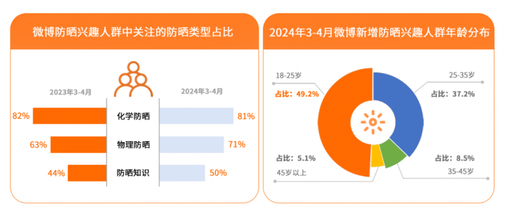 如今,防晒要趁早不仅体现在春季防晒市场的火爆,防晒人群的年轻化趋势也更加明显。2024年3-4月微博新增防晒兴趣人群中,18-25岁的占比最高达到49.2%,18-25岁已经成为新增防晒市场的主力人群。