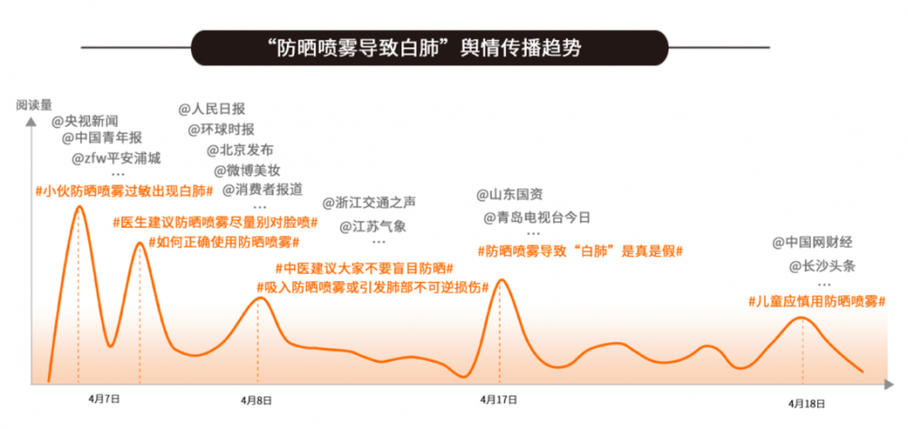 4月7日,@央视新闻 的一条博文引发了网友的关注。一名患者因对着面部喷涂防晒喷雾且有吸入情况,引起了急性过敏性肺炎,导致CT影像显示双肺出现严重“白肺”。随后,多家头部媒体、大v就如何正确使用防晒喷雾、防晒喷雾尽量别对脸喷、中医建议不要盲目防晒、儿童慎用防晒喷雾等进行了一系列的提示。整个事件持续超过10天,相关话题累计阅读量超8000万。