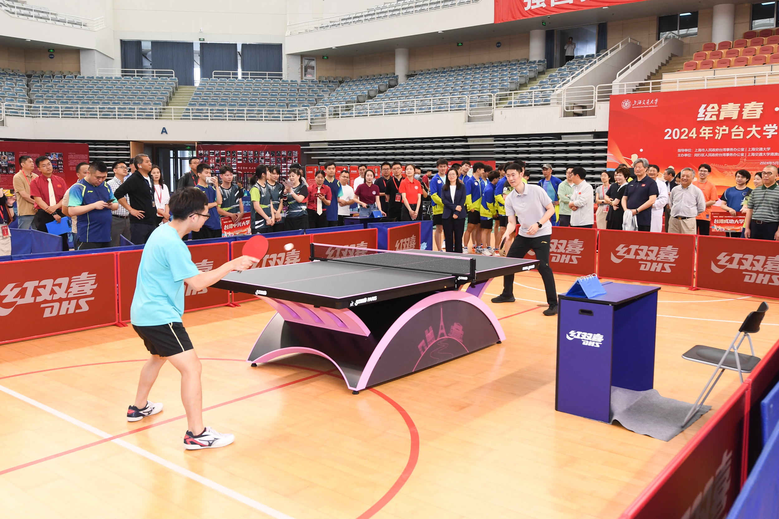来自上海交通大学、华东理工大学、台湾清华大学、台湾成功大学、台湾中兴大学和淡江大学等两岸六所高校的八支乒乓球队以球会友、以赛传谊,切磋乒乓技艺。