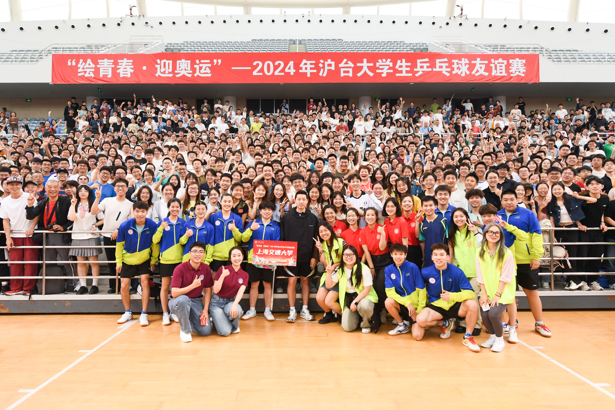 徐寅生和许昕开球,施之皓、曹燕华、丁松、王励勤现场教学,上海交通大学闵行校区的周末好不热闹。“绘青春·迎奥运”2024年沪台大学生乒乓球友谊赛5月25日举行,多位乒乓世界冠军作为交大校友与2000多名乒乓球爱好者共同见证这场“青春较量”。