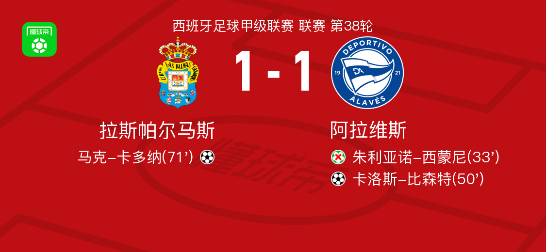 5月26日,西班牙足球甲级联赛迎来第38轮的比赛,拉斯帕尔马斯在主场迎战阿拉维斯。比赛中,马克-卡多纳为拉斯帕尔马斯打破僵局,而卡洛斯-比森特则为阿拉维斯攻入一球。最终,双方握手言和,比分定格在1-1。