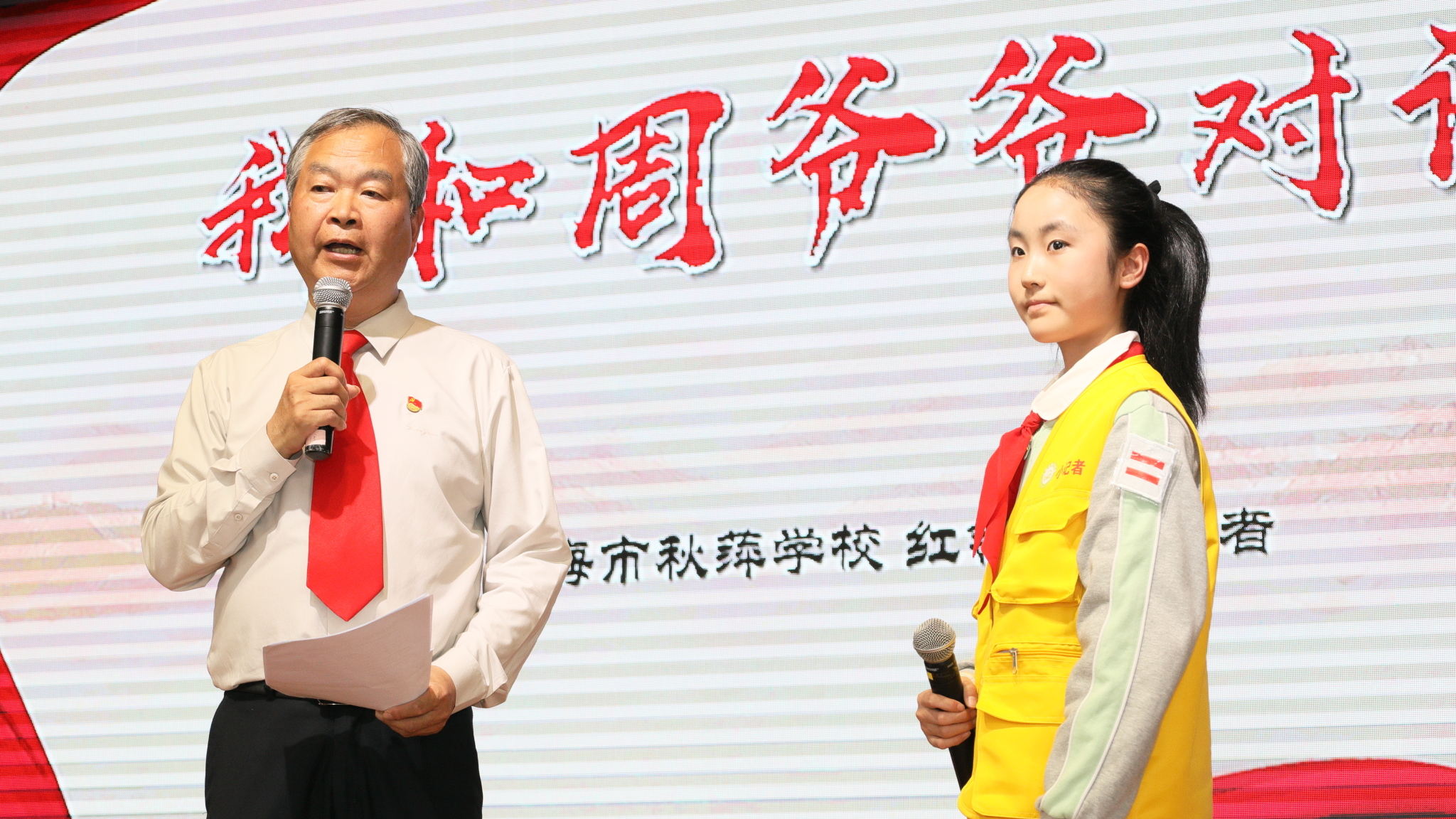 2024年4月,浦东新区启动“红色故事我来讲,百校齐颂爱国情”主题活动。图为秋萍学校的小记者在采访周大根烈士之孙周亚南。