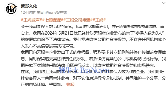荒野文化回应称,事实上,我司在2024年5月21日就已经针对天眼查企业发布的关于“参保人数为0人”的虚假信息给予了法律警告,已向天眼查企业发出正式的律师函,声明最后荒野文化还附上参保信息,以证明并非是参保人数为0的企业。