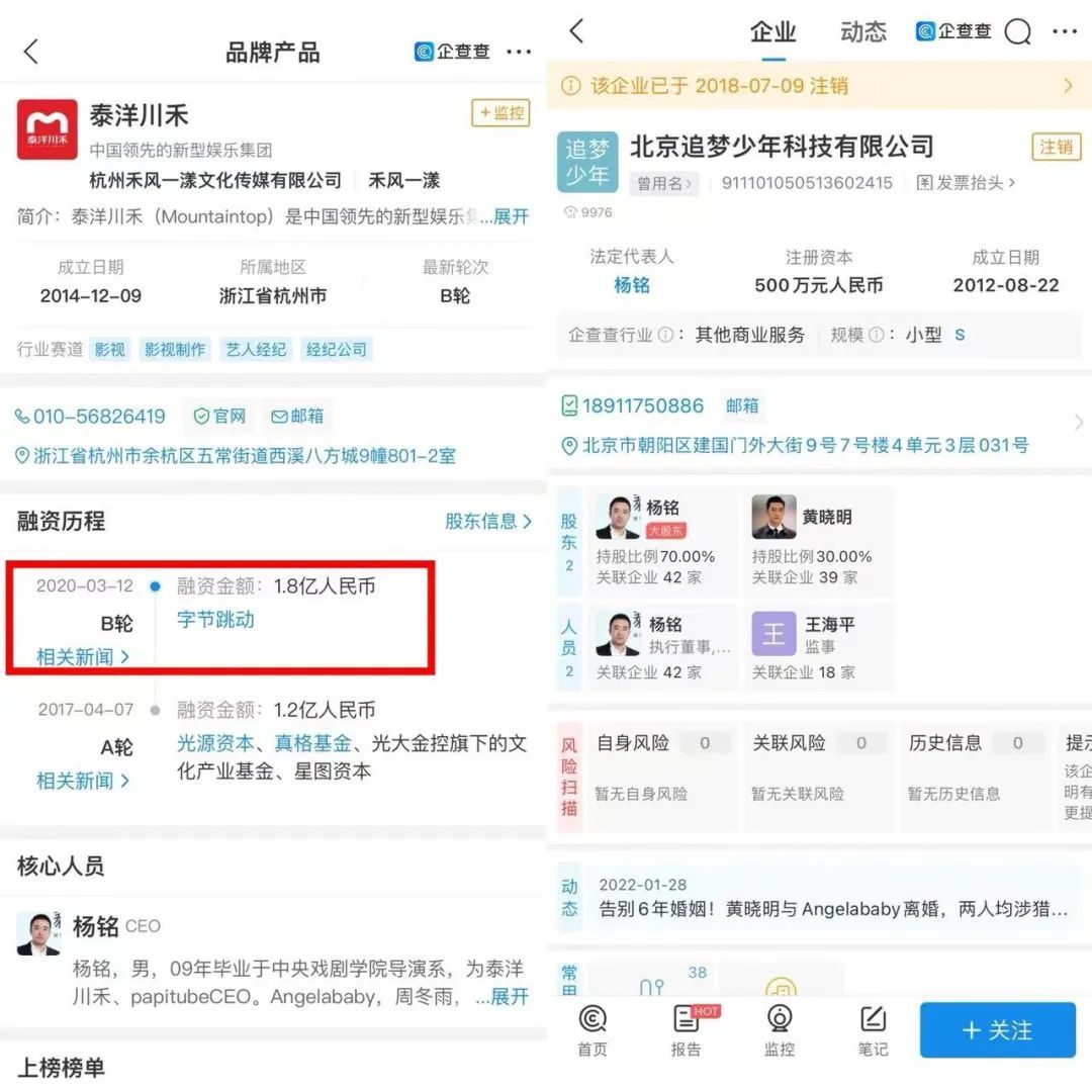 泰洋川禾CEO杨铭也是从华谊出走的经纪人,曾经当过周迅的助理,后来跟黄晓明创业成立泰洋川禾,曾经带过Angelababy、周冬雨等头部艺人。同样也是在2018年,黄晓明与杨铭唯一的资本联系——共同出资成立的北京泰洋川禾(后改名北京追梦少年)注销了。
