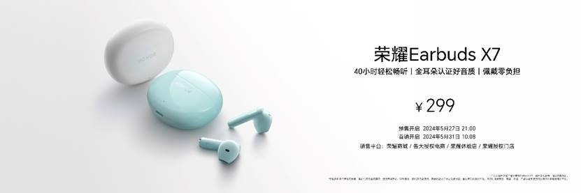 全新荣耀Earbuds X7, 拥有和荣耀200系列同款配色——天海青和月影白,采用半入耳式设计,通过了中国电子音响行业协会的“金耳朵音质认证”,拥有40小时超长续航,售价299元。