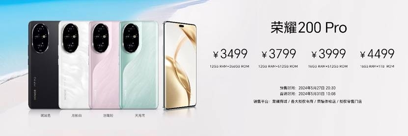 荣耀200系列于5月27日正式开启预售,其中荣耀200共有12GB+256GB、16GB+256GB、12GB+512GB、16GB+512GB四种配置,起售价格2699元;荣耀200 Pro共有12GB+256GB、12GB+512GB、16GB+512GB、16GB+1TB四种配置,起售价格3499元。