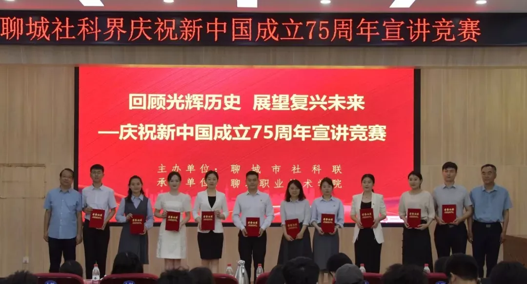 自4月15日聊城市社科联印发《关于举办聊城社科界庆祝新中国成立75 周年宣讲竞赛的通知》以来,聊城社科界各单位积极推荐选手参赛,市社科联根据参赛选手自报的宣讲稿PPT、视频等,经过初审初评,最后确定22名选手参加现场竞赛。根据初评及现场评委评选情况,经综合评定,最终决出一等奖 10 名,二等奖 12 名,三等奖12名。活动现场,市社科联党组成员、副主席李新杰、聊城职业技术学院党委委员、统战部部长崔爱民为获得一等奖的选手颁发了荣誉证书。根据山东省社科联《关于开展“回顾光辉历史 展望复兴未来——庆祝新中国成立75周年”宣讲竞赛的通知》要求,市社科联将推荐一等奖获奖选手参加由山东省社科联组织的全省比赛,在全省比赛中胜出的优秀选手将参加全国宣讲大赛,并遴选部分优秀选手开展全省巡回宣讲,进一步扩大社会影响。