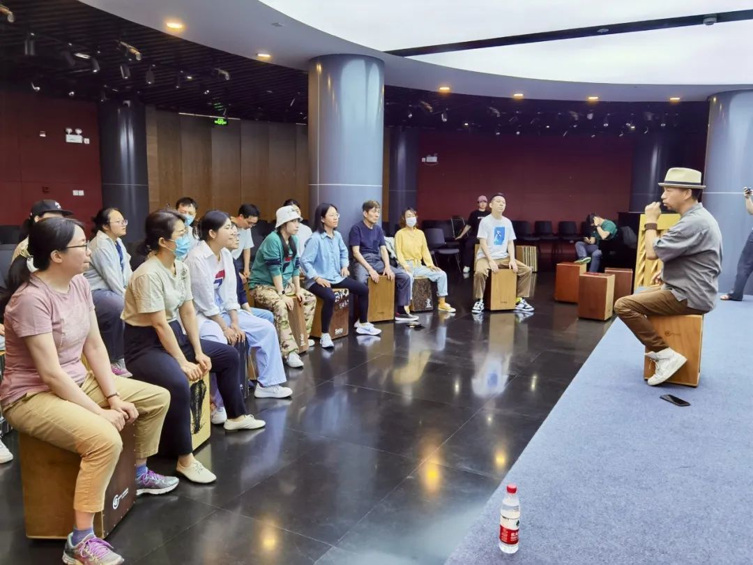 除了“我心中的文化馆”宣传调研活动,长宁文化艺术中心还在各个阵地举办了一系列丰富多彩的演出、展览、培训等线上线下文化活动。在中心三楼的“长艺书苑”,上海评弹团的国家一级演员毛新琳和周慧连续多日为曲艺爱好者们带来了长篇弹词《十美图》;5月25日,中心还邀请了馆办群众文艺团队“律都国际打击乐团”团长、上海音协打击乐专业委员会理事袁朝桢老师,以上海童谣改编曲目为教学范本,通过生动有趣的线下课堂普及打击乐知识,并带领学员体验打击乐器的乐趣;中心一楼的“音乐会客厅”也展示了相关书籍和乐器,后续还将滚动播放打击乐教学视频,让每天踏入艺术中心的群众可以常态化、沉浸式学习和欣赏。