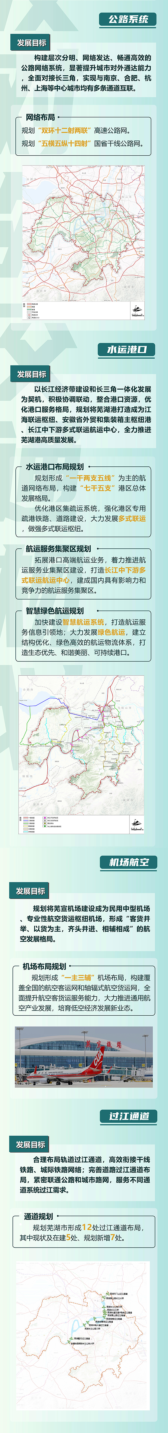 提升航空机场系统,规划形成“一主三辅”(芜宣机场、无为通用机场、南陵通用机场、湾沚通用机场)机场格局。