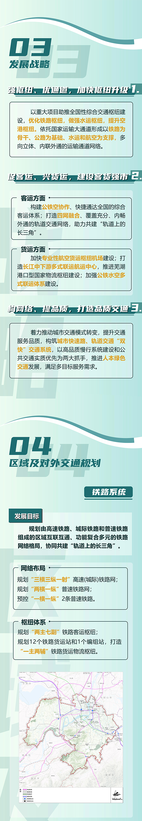 优化铁路系统,规划布局“三横三纵一射”高铁城际(包括北沿江高铁、合芜宣城际、宁安城际、商合杭高铁、合福高铁、芜常城际及规划预留的高速磁悬浮系统)和“两横一纵”普铁网络(包括宁芜铁路、芜铜铁路、淮南铁路、皖赣铁路、庐铜铁路、铜南宣铁路);