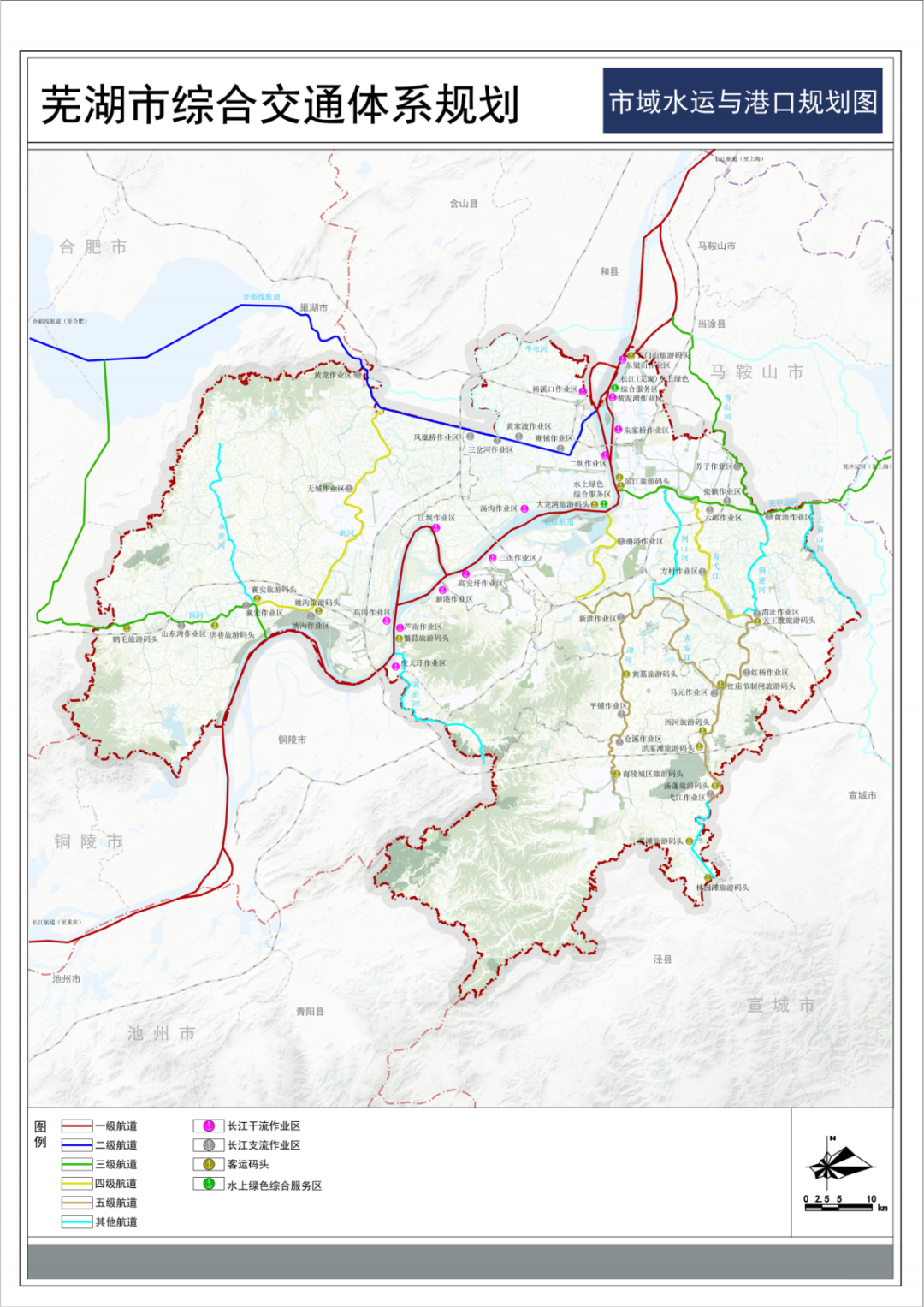 做强港口水运系统,规划形成“一干两支五线”为主的航道网络(“一干”长江黄金水道;“两支”合裕线和芜申运河;“五线”青山河、风襄河、西河、青弋江、漳河)和“七干五支”港区格局(“七干”朱家桥港区、裕溪口港区、三山港区、荻港港区、高沟港区、白茆港区、滨江港区;“五支”无为支流港区、繁昌支流港区、南陵港区、湾沚港区、清水港区);