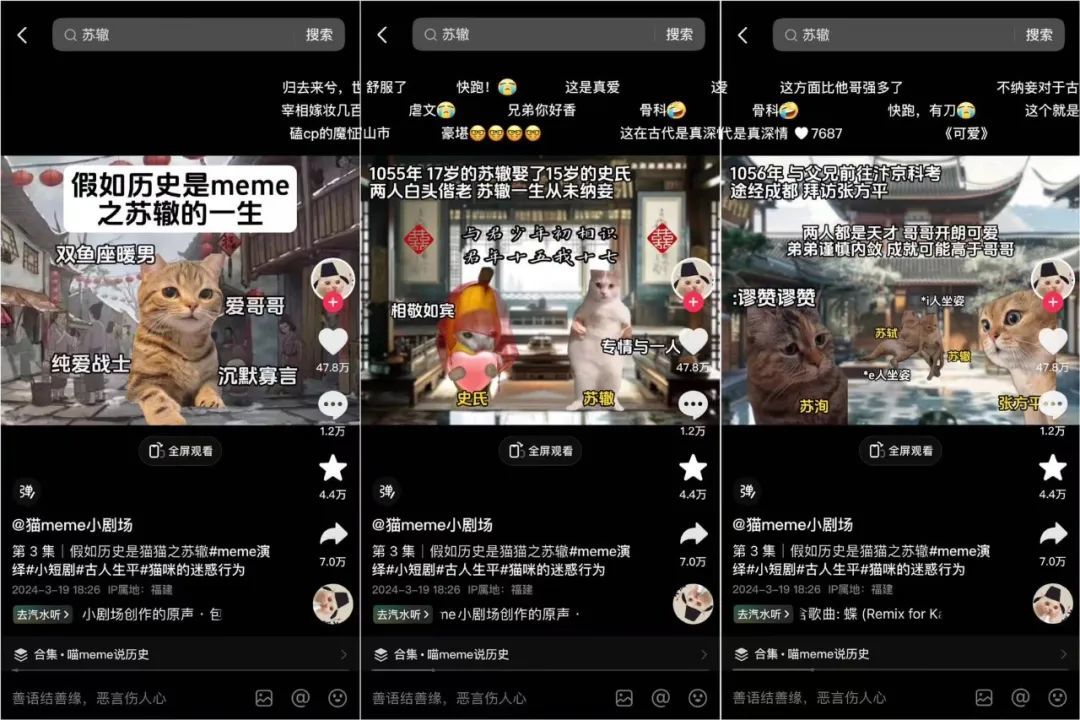 比如,抖音账号@猫meme小剧场,过去也是利用猫猫表情包做短视频,但水花并不大。3月初他及时把握住这波热度,做了《假如历史是meme之xx的一生》系列短视频,用猫meme做主角向大家科普古代名人的生平,被很多网友盛赞是真正的寓教于乐,账号也由此收获了远超往常的热度。