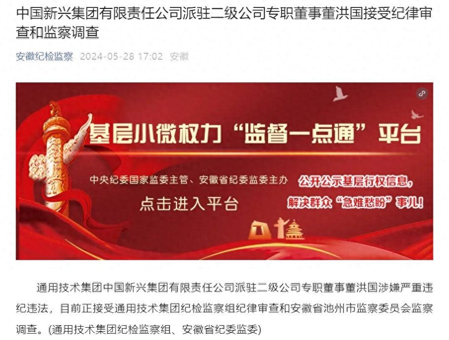 5月28日,据“安徽纪检监察”消息,通用技术集团中国新兴集团有限责任公司派驻二级公司专职董事董洪国涉嫌严重违纪违法,目前正接受通用技术集团纪检监察组纪律审查和安徽省池州市监察委员会监察调查。