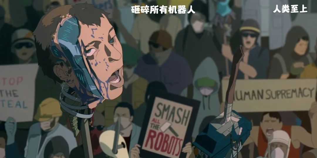 街道上挤满了愤怒的人们,他们举着标语、海报、机器人的头颅,群情激奋喊着口号,游行示威。