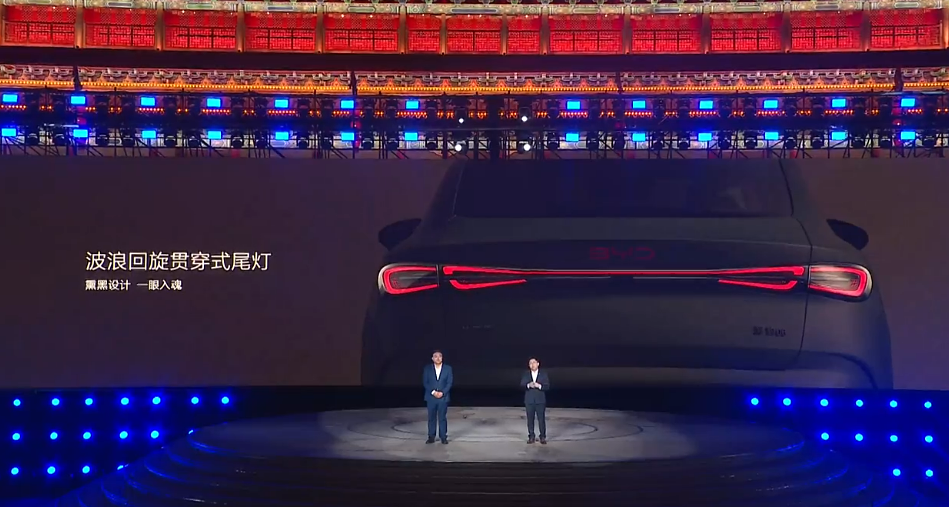 尾部整体设计简洁,贯穿式尾灯是家族化设计,左右两侧的光源很特别,是“中国结”样式,尾门拥有BYD英文字母以及DM-i和秦L的标识。