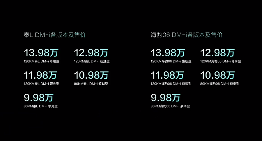 比亚迪海豹06与秦L一样,都提供5款车型,售价区间均为9.98-13.98万元。它的上市将进一步丰富比亚迪海洋网的产品线,与秦L共同抢占家用车市场。