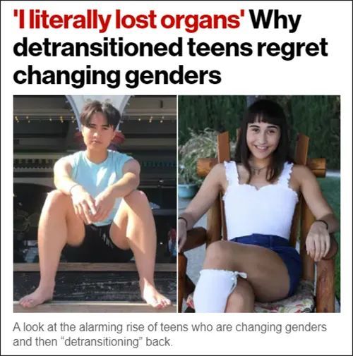 有好多人认为,这一切完全正常、合情合理。而这种看法似乎鼓励了越来越多的未成年人改变性别。同时,那些跨性别后改变主意,决定再度转变回原来性别的青少年人数,正在惊人地增长。可悲的是,这些人,将不得不在他们的余生中与不可逆转的医疗后果作斗争。