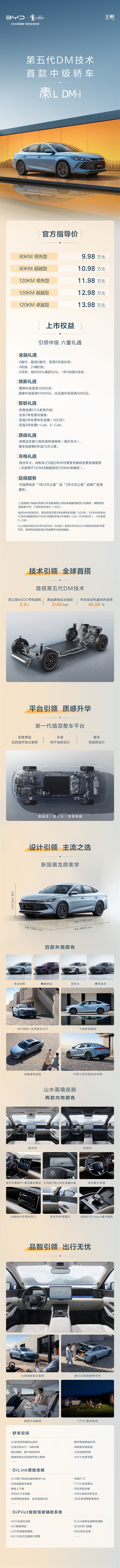 其最大的亮点在于出自比亚迪新一代插混整车平台,首发搭载了比亚迪第五代DM技术,发动机最高热效率46.06%,满油满电综合续航里程2100公里,NEDC百公里亏电油耗2.9升,将油耗首次带入到2时代。