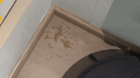 在遇到内直角墙角、家具底部的转弯处时,追觅X40 Pro Ultra的边刷自动外扩,配合可以变形的刷毛,能实现更严密的贴边清洁。通过动图可以看到,追觅X40 Pro Ultra的边刷将墙角完全覆盖,洒在墙角的小颗粒物扫除的十分干净。