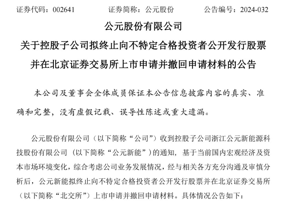 5月29日,公元股份(002641.SZ)发布公告称,其控股子公司公元新能已决定终止北交所上市申请,并撤回相关材料。