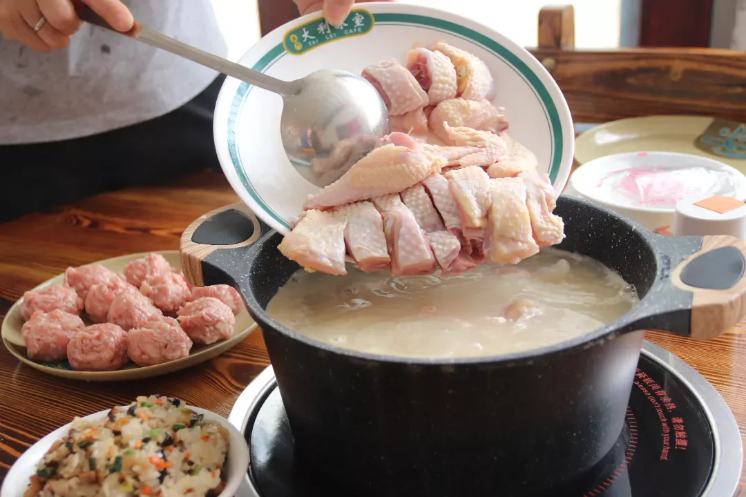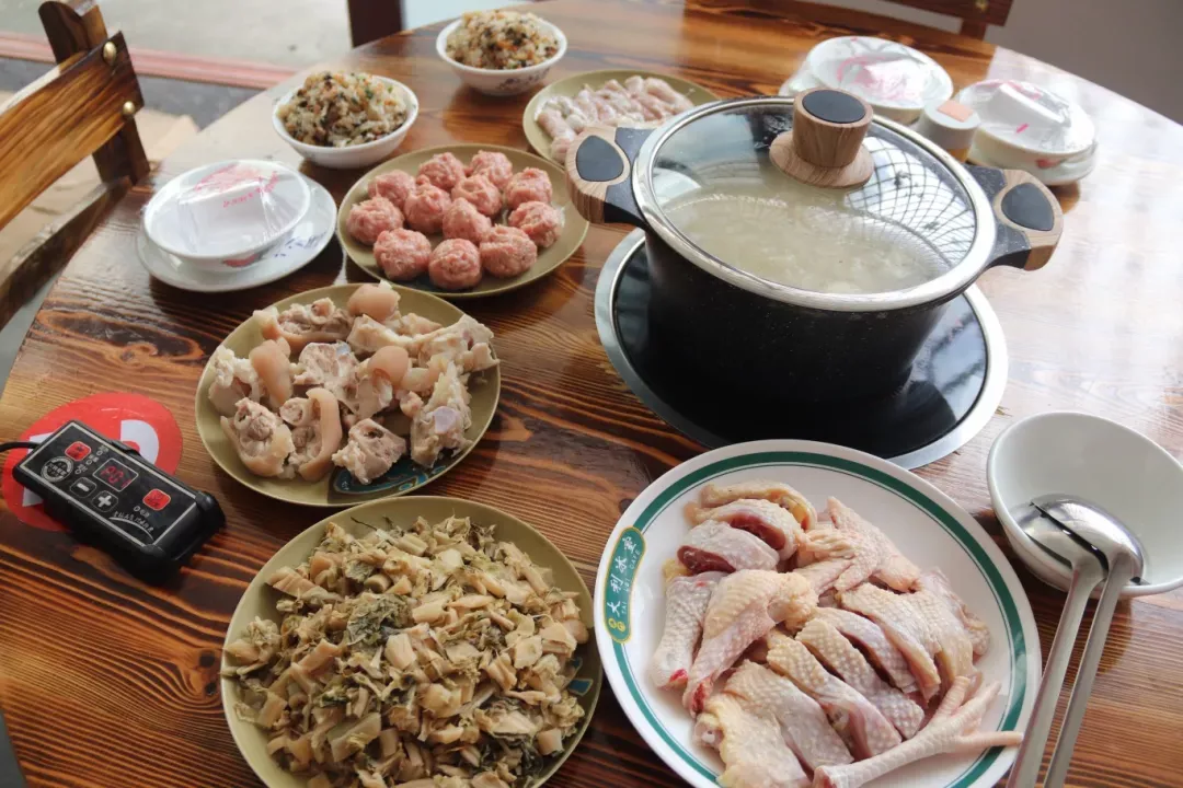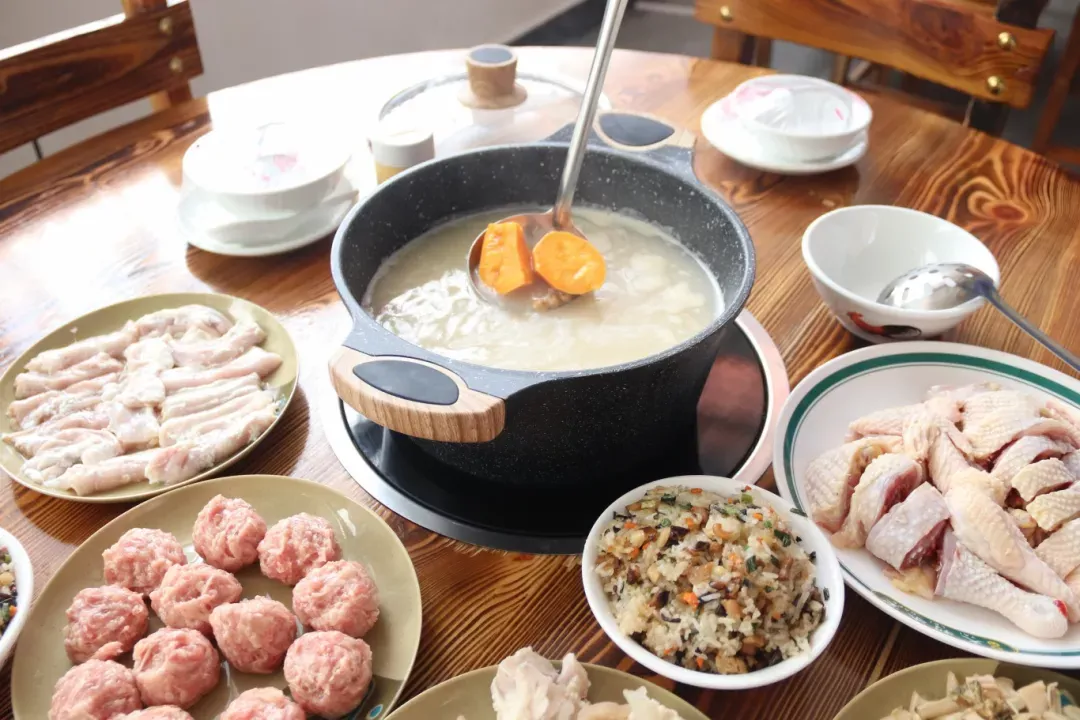 在六婶大旗头醋坊的菜单上,可以看到有普通和祛湿两种锅底。以长寿醋为底,加入姜片、黄豆、番薯、猪脚、肉丸等各种配料食材,煮开后加入梅菜、土鸡和自己喜欢的菜,细火慢煮,这便是长寿醋火锅的经典吃法。