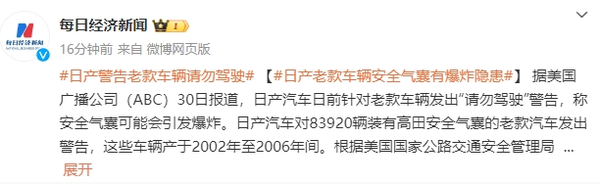 近日,CNMO了解到,据美国广播公司(ABC)报道,日产汽车公司紧急发出警告,敦促约8.4万辆旧款车辆的车主切勿驾驶。这些车辆由于安装了存在严重安全隐患的高田安全气囊充气装置,在碰撞中可能爆炸并抛射危险金属碎片,对乘客构成致命威胁。