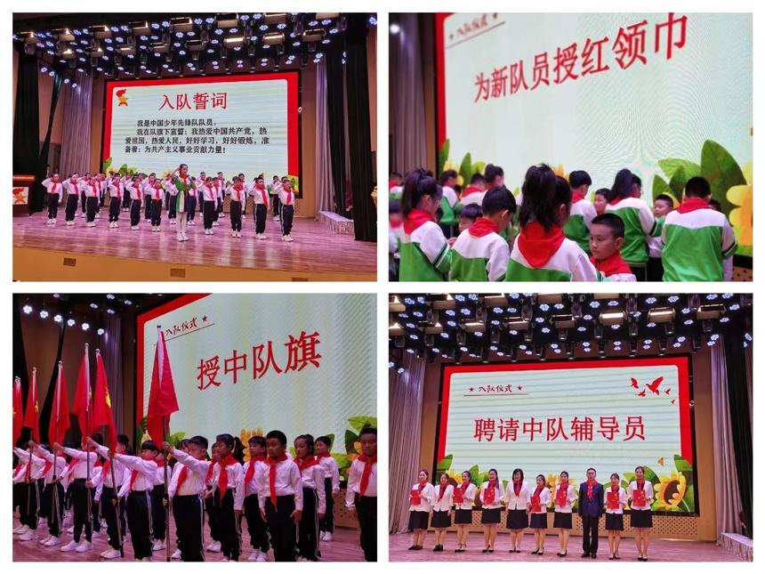 在铿锵的少先队鼓号声里,入队仪式正式开始。英姿飒爽的少先队小旗手出少先队队旗,少先队员们合唱《中国少年先锋队队歌》、哈尔滨新区花园小学校少工委主任和大队辅导员分别宣读组建年级少先队组织的决定和新队员名单、少先队员代表为新队员戴上鲜艳的红领巾。新队员们站在队旗下庄严宣誓。仪式上,还为新建中队授中队旗,为新聘任的中队辅导员颁发聘书。