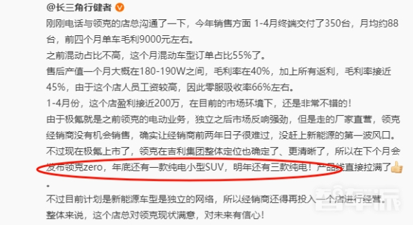近日,一名汽车博主发微博称,自己与一位领克汽车的店总沟通了一下,今年1-4月该店交付了350台,月均约88台,前4个月单车毛利在9000元左右。之前混动车型销售占比不高,但本月混动车型订单占比55%。此外,该店售后产值一个月大概在180万-190万之间,毛利率在40%,加上所有返利,毛利率接近45%。整体来看,1-4月份,这个店盈利接近200万元,在目前的市场环境下属于非常不错的成绩。
