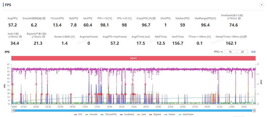 改写并丰富下面内容,要非常的流畅:在《原神》游戏中,开启了全特效与高画质,并且设置为60帧模式,然后进行持续半个钟头的深渊战斗场景测试。最后PerfDog记录的平均帧率也达到了57.2帧,游戏过程中画面非常流畅而且没有出现明显卡顿,重负载游戏表现同样不输旗舰级手机。