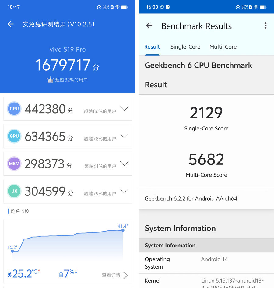 在安兔兔V10版本的跑分测试中,vivo S19 Pro实现了超过167万分的优异成绩;而在GeekBench 6测试中,其单核得分达到了2129分,多核得分则高达5682分,这样的表现已经接近许多搭载第二代骁龙8+移动平台的旗舰手机水平。作为一款主打轻薄的中端手机,vivo S19 Pro强劲性能确实令人意外,即便是游戏玩家也能完全不用担心手机卡顿等问题。 此外,vivo S19 Pro还配备了高达512GB的UFS 3.1闪存和至高16GB的LPDDR5X运行内存,形成了标准的性能铁三角。这意味着它不仅在处理速度上表现出色,还能提供超大的存储空间和流畅的多任务处理能力。