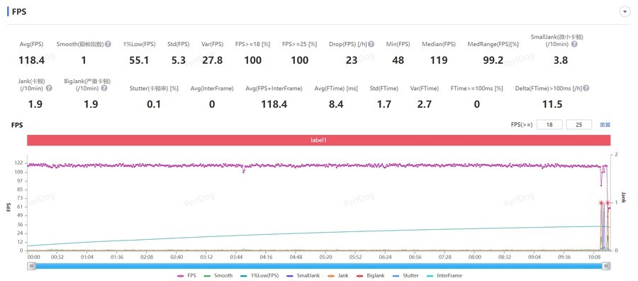 在《王者荣耀》中,启用了120帧模式和超高分辨率后,PerfDog记录的平均帧率达到了118.4帧,无论是在游戏的前期对线还是后期团战,画面都呈现出极其稳定的状态,没有出现明显的波动。同时,在游戏过程中手机的机身温度并没有升高到让人感到不适的程度,温和的手感让玩家能够长时间持续游戏而不感到手部不适,进一步提升了游戏体验的舒适度。