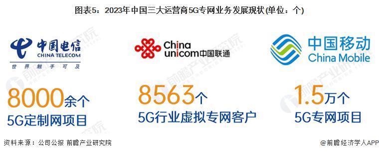 中国三大运营商都已经分别推出各自 5G 专网模式。截至 2023 年 12 月,中国电信已在制造、能源、医疗、教育、智慧城市、交通、文旅等领域打造 5G 专网 8000 余个 ;中国联通5G 行业虚拟专网服务客户数达到 8563 个,较 2022 年底增加 4758 个 ;中国移动5G 专网项目落地超 1.5 万个,5G 专网充分融入行业办公生产环节,收入突破 50 亿元。