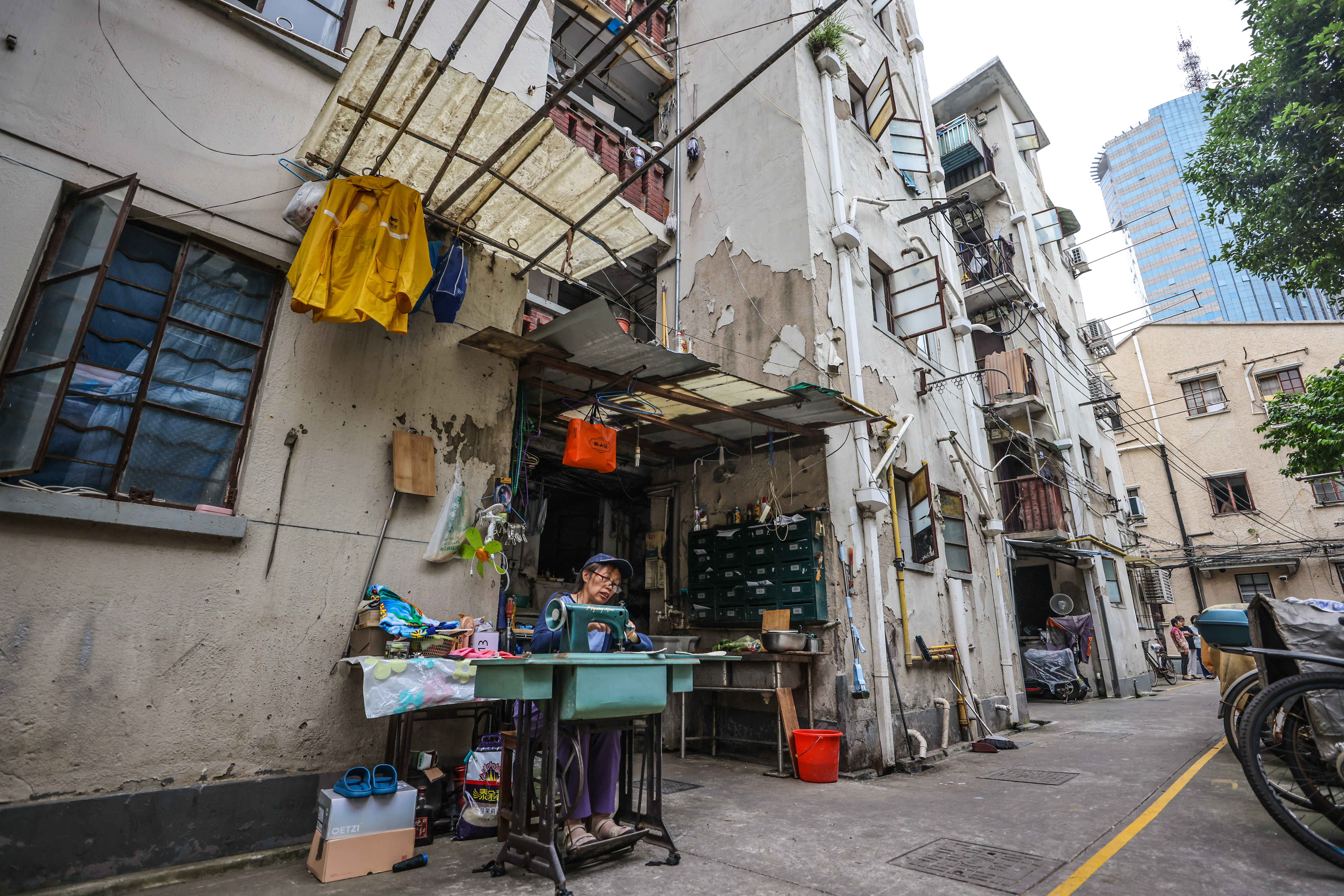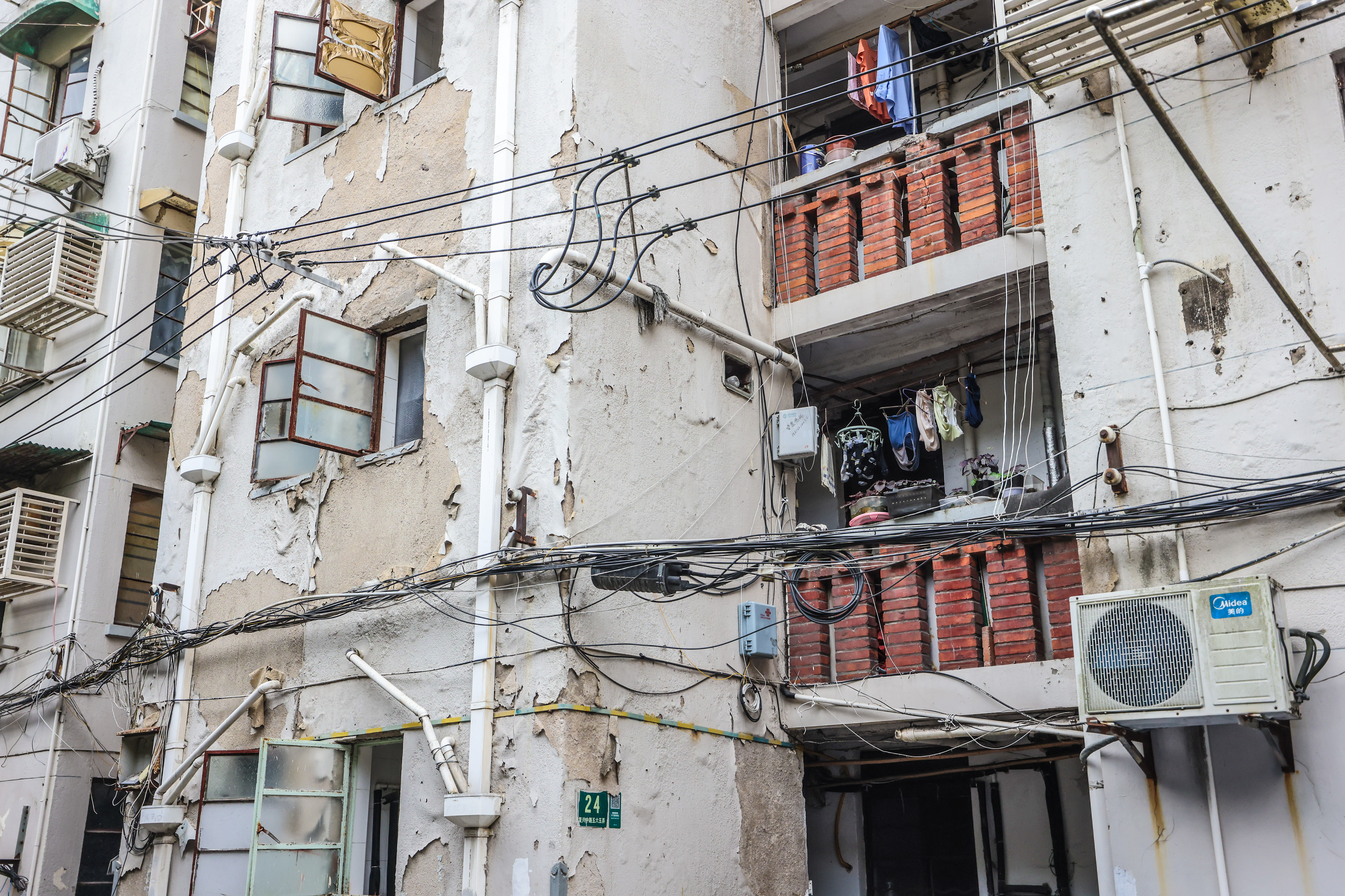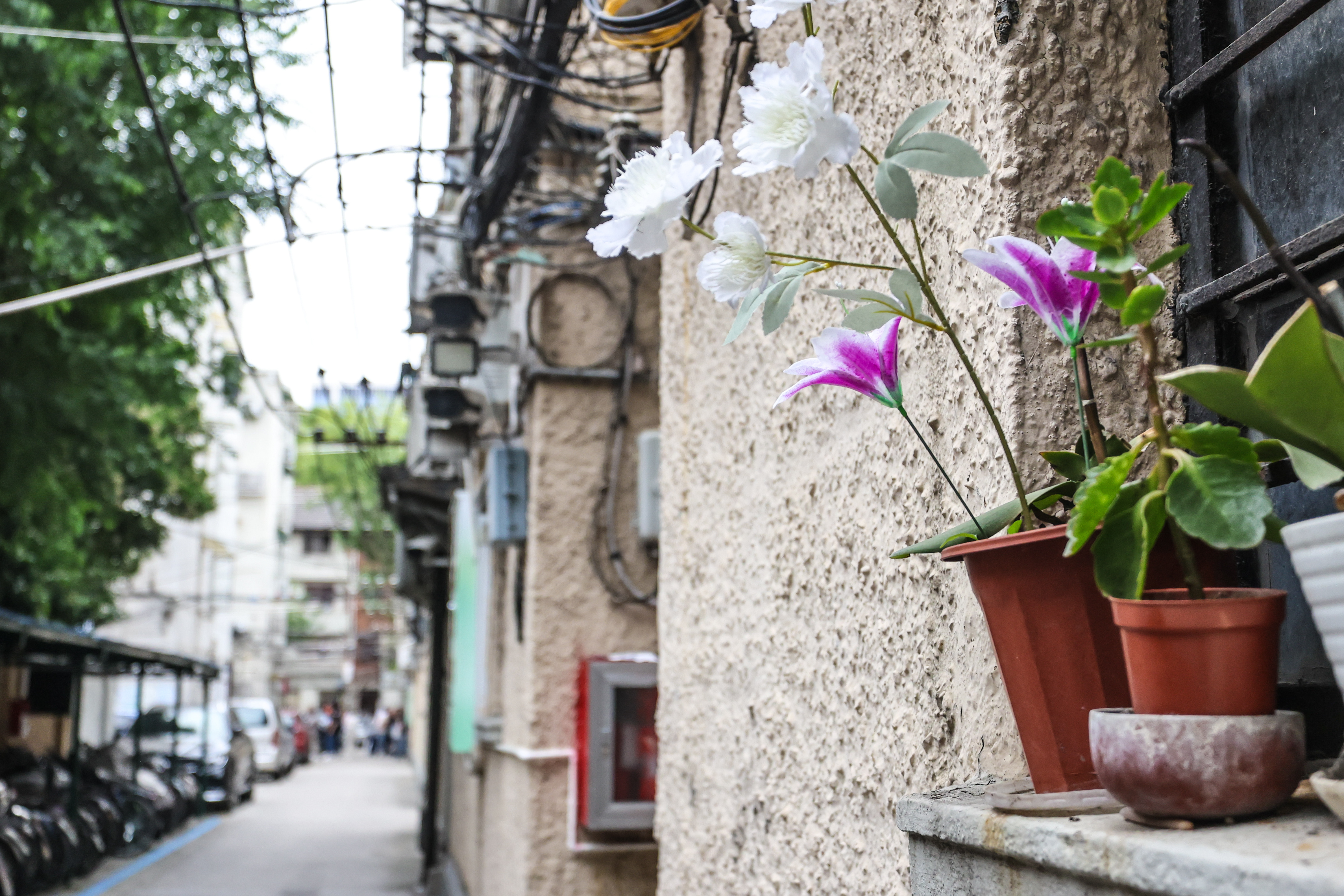 但一头是衡复历史文化风貌区保护建筑,是沿墙枇杷树掉落的果实,绿意盎然爬满了一面墙的爬山虎,和姹紫嫣红的小花窗。另一头,是墙面斑驳的小梁薄板房,有些地方甚至裸露出了钢筋,外立面轻轻一拍,石灰抖落。