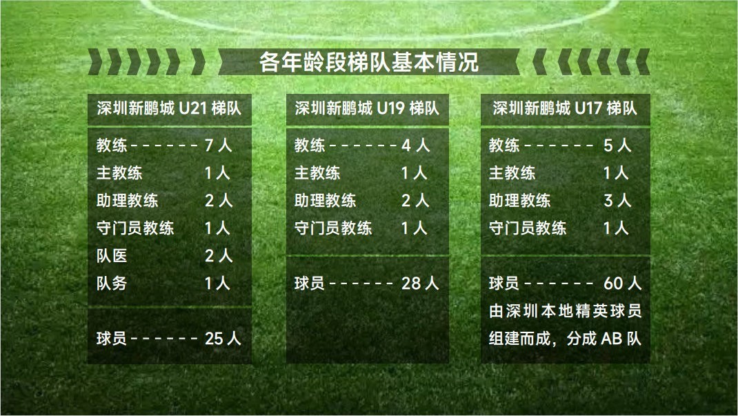 新鹏城官方写道,青训是职业足球俱乐部生存与可持续发展的核心,承担着为一线队及各级国字号球队培养人才、输送人才的重要使命。深圳新鹏城足球俱乐部着眼未来,全力组建、发展各年龄段青训梯队,本年度目标是完成U13至U21共六个年龄段青训梯队组建工作,并确保各梯队以完整建制安全、顺利参加各项青少年足球赛事。