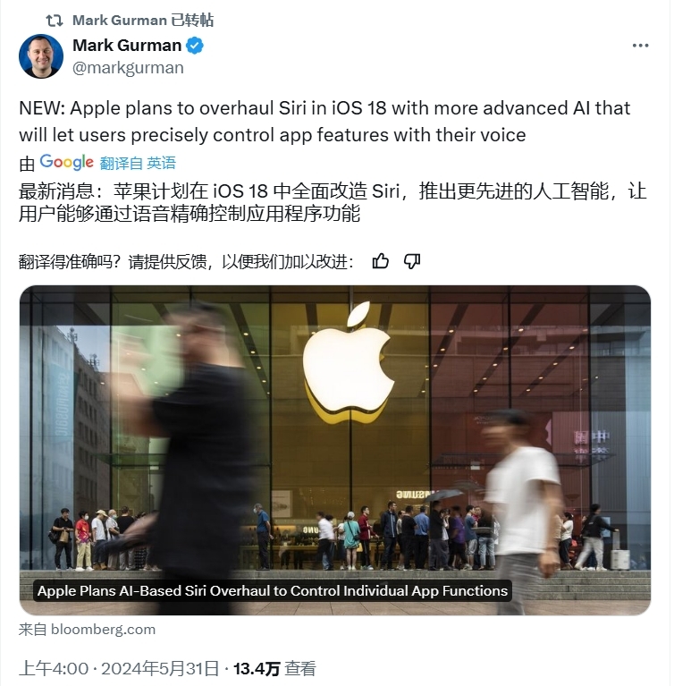 ZAKER科技5月31日消息,知名科技记者马克·古尔曼报道称苹果计划在iOS 18中全面改造Siri,推出更加先进的人工智能,让用户能够通过语音精确控制应用程序功能。