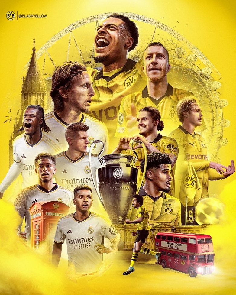 北京时间周日凌晨3点,多特将在温布利迎来对阵皇马的欧冠决赛,赛前,多特官方在社交媒体上晒出了本场比赛的预热海报。