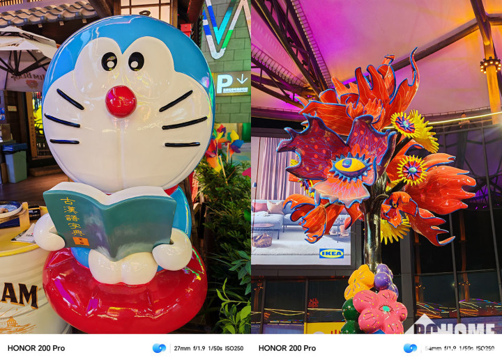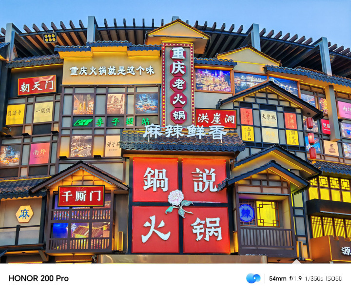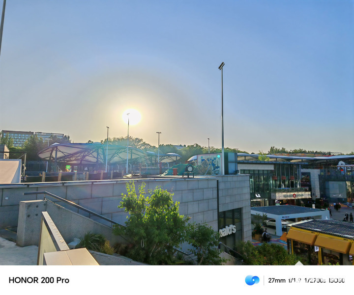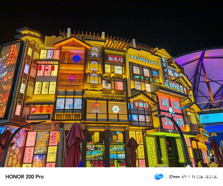 在一些典型拍照场景中,荣耀200 Pro能够灵动的变换焦段来进行构图,场景识别能力准确,能够让画面效果更为生动。画面色彩贴近真实效果,画面具备高动态效果和高宽容度,比如屋檐下的暗部区域细节保留完整,同时天空与灯箱的高光部分不过曝。另一张大逆光的样张中,太阳强光压制得十分优秀,甚至在光球层中的路灯也得到了保留。