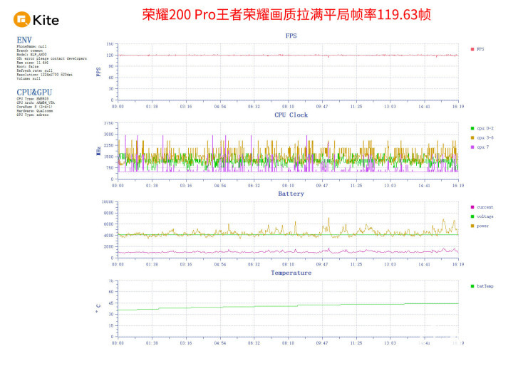 游戏实战上,首先来看王者荣耀,画质拉满玩上一局,平均帧率119.63帧,帧率曲线非常平稳,没有波动情况,后期十人开团也相当流畅。游戏平均功耗4.38W,开启极限画质还是对功耗有影响。正面最高温42.8度,背面最高温41.6度。