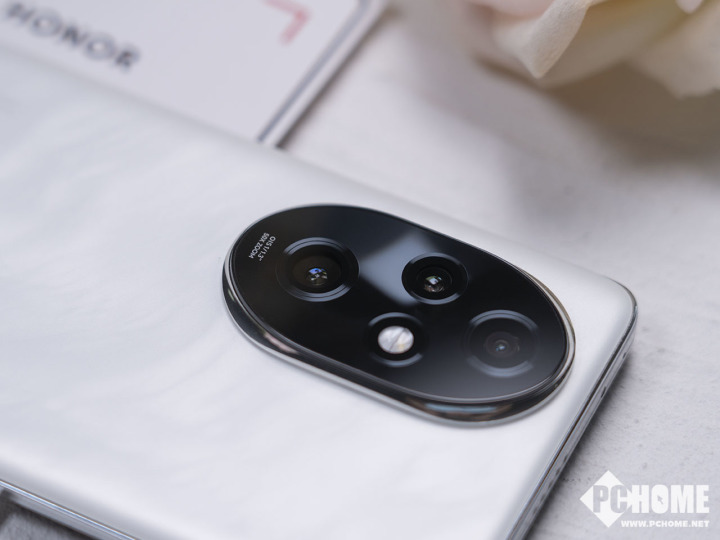 荣耀200 Pro在镜头部分的设计非常有辨识度,中轴对称的椭圆造型新艺术之镜,边缘部分的保护圈则采用弧形曲线造型,让整个部分充满了几何美感。