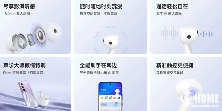 OPPO Enco R3耳机采用了13.4mm的超大尺寸动圈单元,并搭配了Reno定制调音——幻紫星河。
